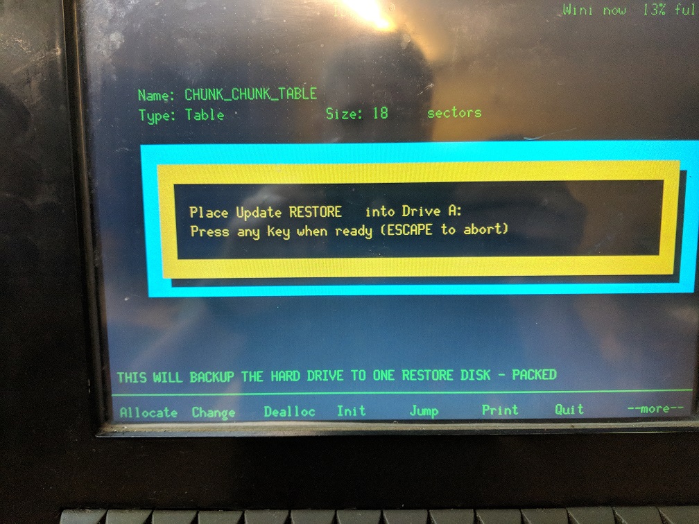 Remove the SAVE Disk and insert the RESTORE disk in at this point. Press any key again.